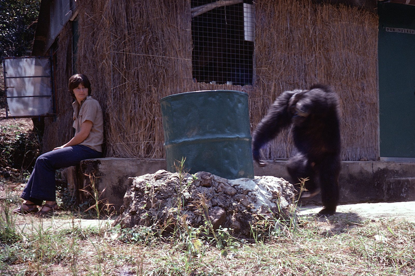 Anne Pusey watches Figan charging at the drum in front of “Pan Palace.”