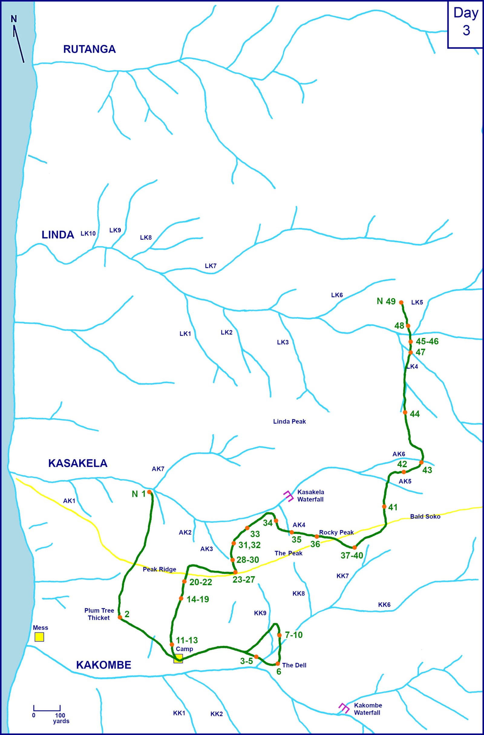 Curt’s Report. Figan was up at 0658 and he displayed three times during travel towards Camp. Fifi and Humphrey joined Figan. Figan displayed at Humphrey upon arrival. Figan passed right through Camp and went to the kilukia tree east of Camp. Winkle and Hugo were already there. Humphrey, Fifi, Patti, and Sherry arrived separately later. Humphrey copulated with Patti. Sherry was submissive to Figan as Figan traveled alone to feed on ngazi at KK9.