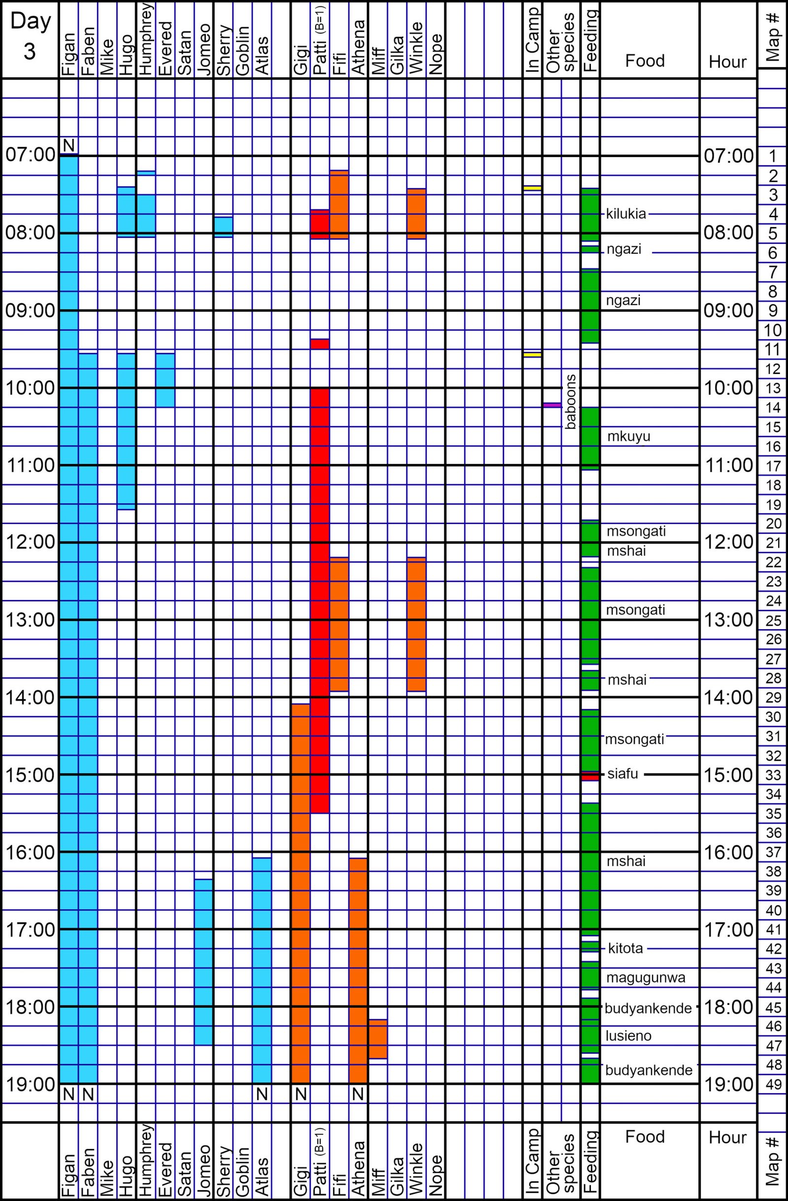 Nesting Details. Figan, Faben, Gigi, Athena, and Atlas had been travel-feeding on budyankende in Upper Linda when they stopped in a small “clearing.” The group sat for a minute and then Faben went into a tree to nest following many grunts by the group. Figan, Gigi, Athena, and Atlas then went into various trees. Faben started building his nest at 1856, followed by Gigi, Athena, Atlas, and Figan – all in separate trees. Figan was about 15 m from the others. The next morning Figan was found in a new nest only 3 m from Faben.