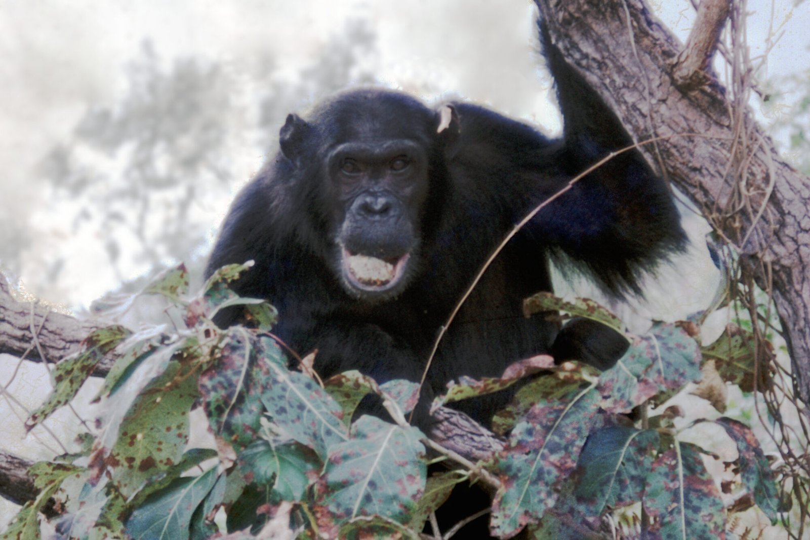 At 0925 there were distant vocalizations from Camp that sent Figan leaping down from the ngazi tree and running towards Camp. Figan drummed at KK9 and arrived in Camp with hair-out soon afterwards. Faben, Evered, and Hugo were in trees as Figan displayed silently into Camp. Evered came to the ground and pant-bobbed to Figan a few meters out of Camp. Faben made no response to Figan’s display. Hugo approached Figan and they mutually embraced (Figan full-open-grin). Evered bobbed again to Figan and they both extended arms for a touch. Figan and Faben groomed a few meters from Evered and Hugo.