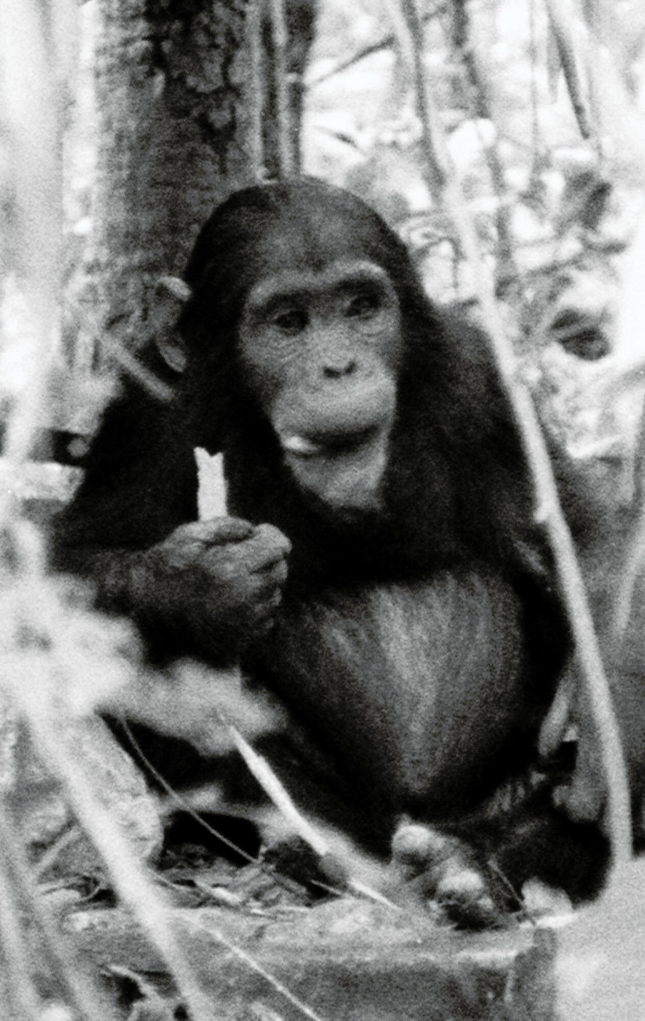 After brief feeding the group traveled to LK4 for some mkuyu. There were many pant-hoots by the group upon arrival. Atlas and the strange juvenile played for several minutes. Play became rough and there were screams. Athena threatened the stranger and Figan displayed at the group. Athena and Atlas Atlas (age 7) eating matete (bamboo). avoided and screamed, and the stranger merely sat as Figan displayed past her. Figan started feeding on bark (insects?) and the others all joined him with great curiosity. Atlas begged from Figan, and at one point was kicked in the head by Figan and thrown against a nearby limb.