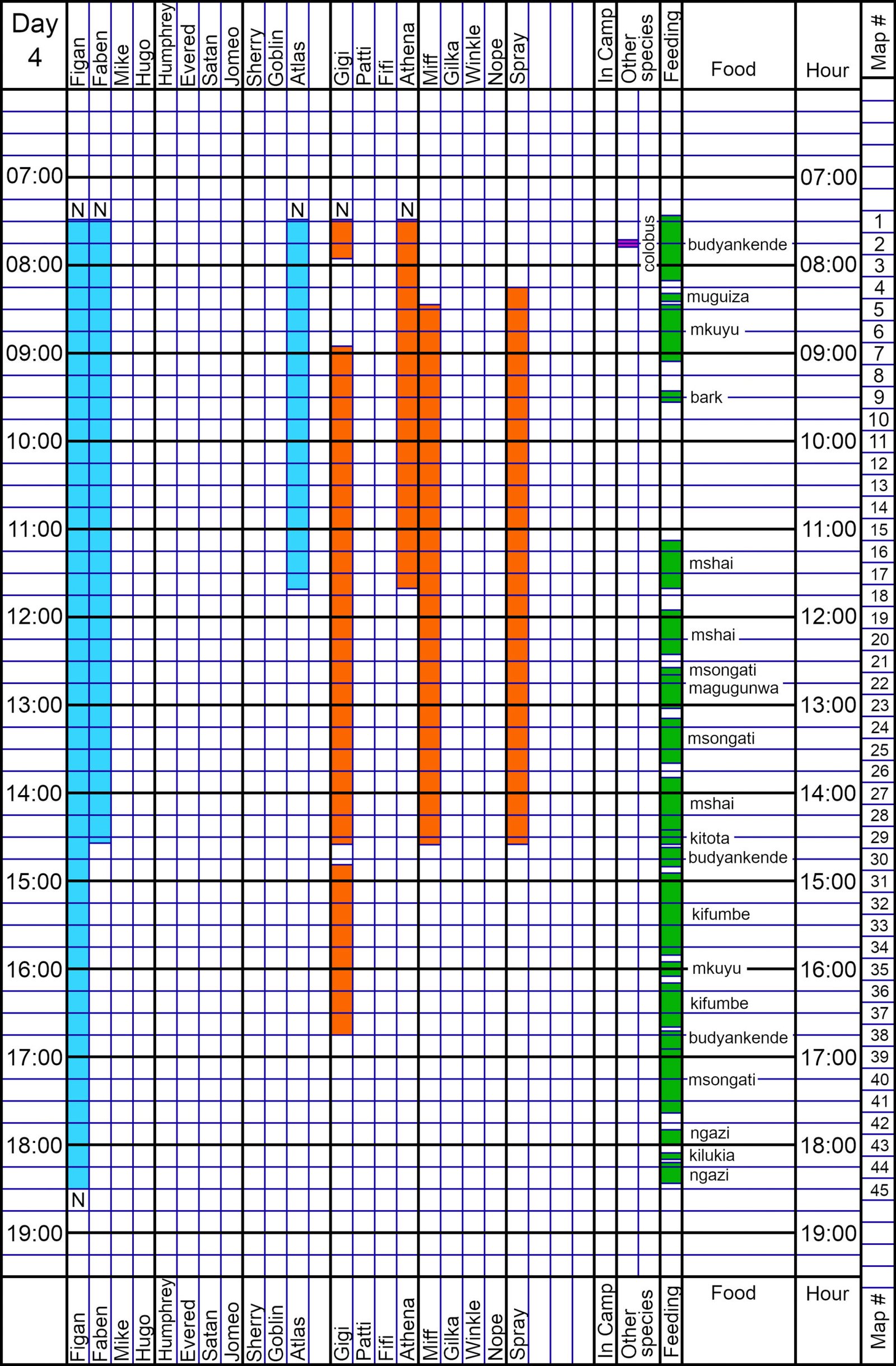 The chimps traveled across the korongo and there were long silent displays by Figan and Faben. The group then settled down to feed on msongati, magugunwa, and mshai. At 1423, Figan and Faben both put hair-out as the group traveled down into LK4. Figan left the others during budyankende feeding and displayed twice perhaps trying to relocate Faben et. al. There was no response and Figan moved on to a kifumbe tree near Linda Peak where he met Gigi. Figan left Gigi in Upper Kasakela and he traveled up to The Peak for msongati. As a perfect ending to a miserably wet day, a heavy rainstorm hit as Figan fed on msongati. The rain eased as Figan STREAKED down to lower KK9 for some ngazi at 1743. (Whoever said that chimps don’t do anything in the rain is crazy!) Fortunately, Figan nested soon afterwards at the Dell.
