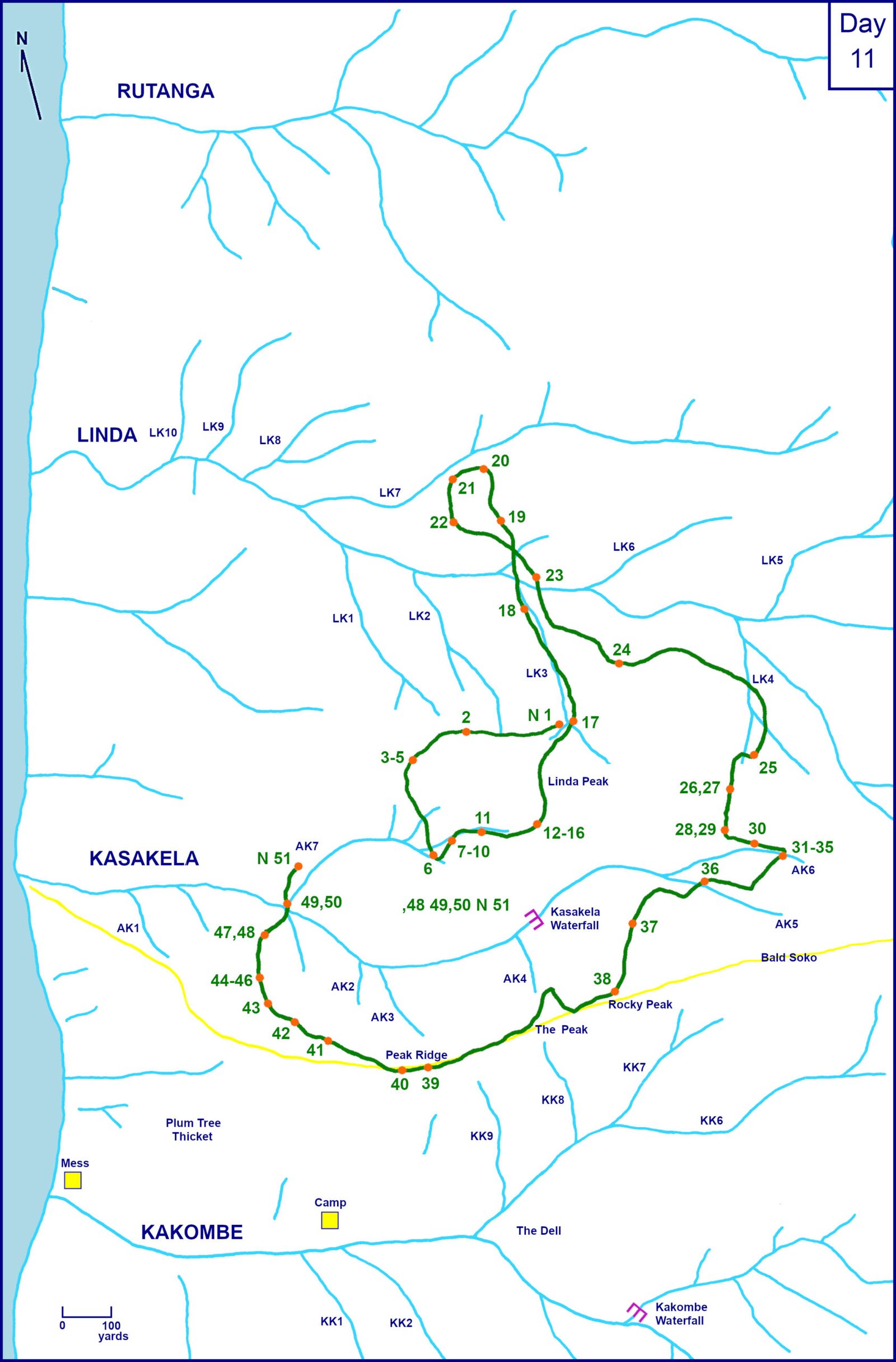 The entire block seemed to revolve about food; the chimps basically going around a circle of Camp, The Peak, Rocky Peak, Linda Peak, Kasakela-Linda ridge, Lower Kasakela, Jane’s house, and then Camp again. Mshai and kifumbe definitely influenced travel. Figan came into Camp on Days 6, 8, 9, and 10, but not on Days 7 and 11.