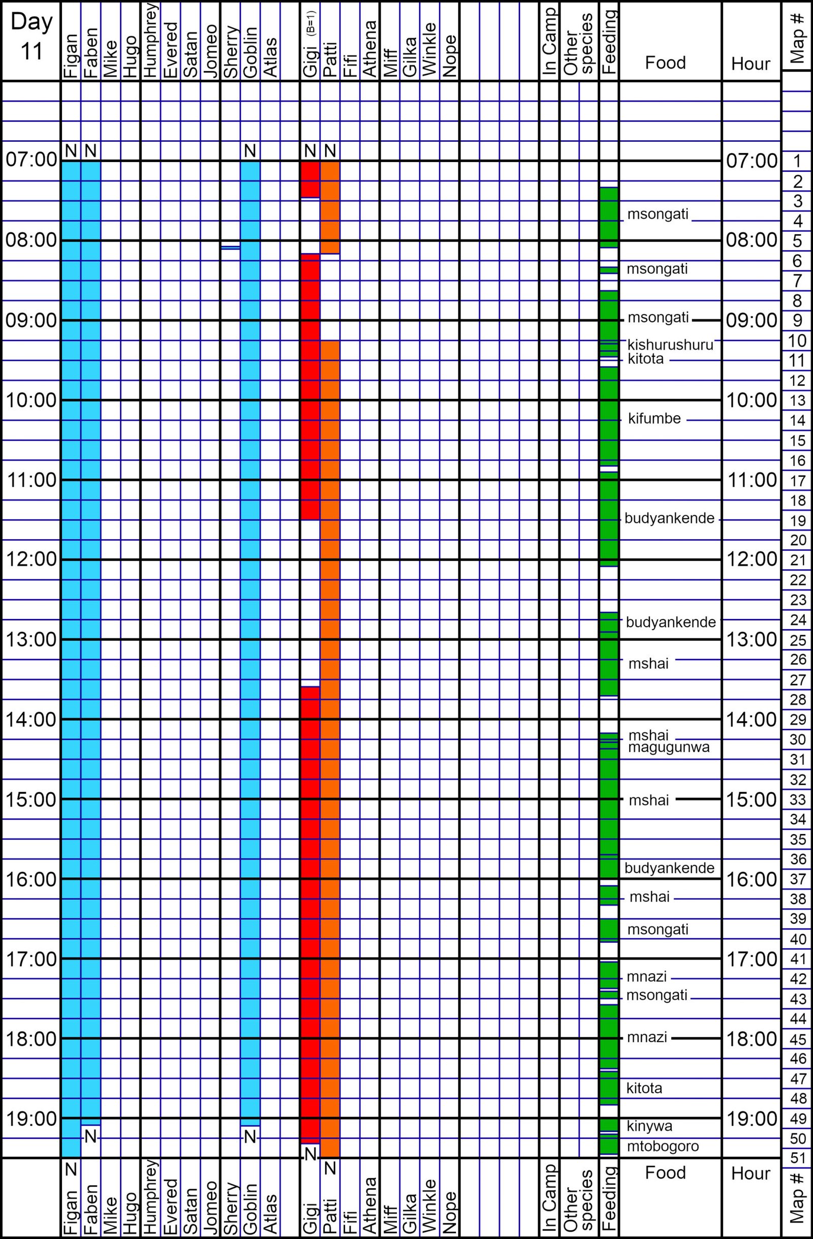 Five Day Summary (Day 6 – Day 11). Little action with ritual travel exploiting the preferred kifumbe, mumunda, and mshai. Travel with Faben was erratic: they met on Day 7 and stayed together until late on Day 8; then came together in the afternoon of Day 10 and stayed together through Day 11. Gigi seemed to lead them into her preferred (?) Linda for budyankende on Day 11. Figan displayed impressively when he met up with groups, and Figan and Faben displayed as usual very well together. Mellow follows, with no predations, stranger contacts, or major ASSRs. Patti down and Gigi rising.
