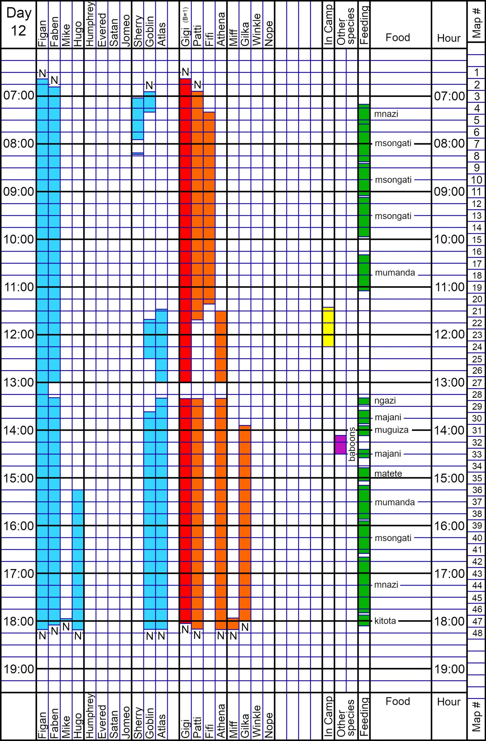 Figan led travel out of Camp towards KK0 where vocalizations had been heard earlier. This apparent search for chimps was fruitless and Figan lost Faben in the process. Figan traveled back to Camp, stopped on the south border of Camp, looked and grunted twice before traveling back down towards the Mess. Figan, apparently by grunting at the border of Camp, had ascertained that Faben wasn’t there. Figan found the group – Faben, Goblin, Athena, Atlas, Gigi, Gilka, and Patti – near Palm Grove.