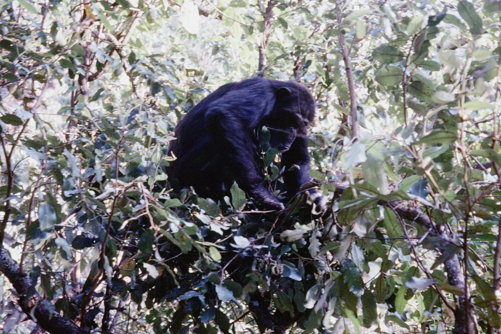 The group fed briefly on muguiza, masagoro, and matete near the Mess and then traveled to Jane’s house for some mumanda. Hugo was present and submissive to Figan at the mumanda tree. Long bouts of msongati and mnazi by this large group preceded brief kitota feeding then nesting in Lower Kasakela. There were several rounds of pant-hoots at the mnazi trees. Figan, Faben, Hugo, Mike, Gilka, Goblin, and Gigi all nested very close together, with Athena, Atlas, Patti, Miff, and Moeza in the distance.