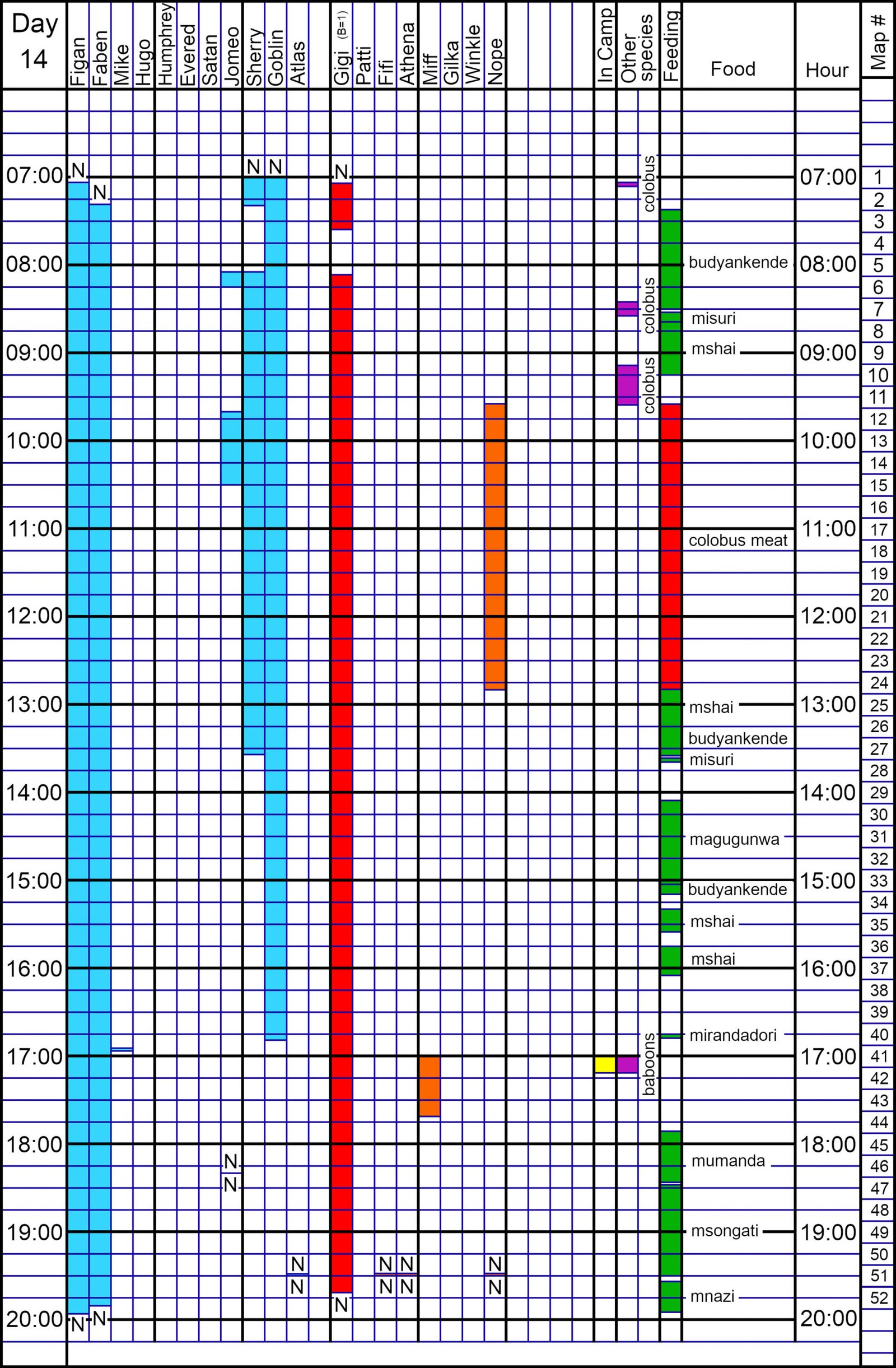 Nesting Details. At 1929, Figan, Faben, and Gigi arrived at the Lower Kasakela mnazi trees after a long msongati feed. Many chimps were present including Fifi, Nope, Mustard, Athena, Atlas, and possibly Miff and Moeza. Many of these chimps were already nested and others were still feeding. There were many group pant-hoots as Figan, Faben, and Gigi arrived and went into the trees to feed. Figan, Faben, and Gigi all exchanged grunts during feeding at 1942. Gigi built her nest a minute later. Others were also heard nest-building, as it was too dark to see. At 1948 Figan and Faben exchanged grunts as by now Faben had finished nest-building. At 1955 Figan went into an old nest only a few meters from his last feed. He quickly refurbished the nest and pant-hooted as he rested in his nest; the others all responded with pant-hoots.
