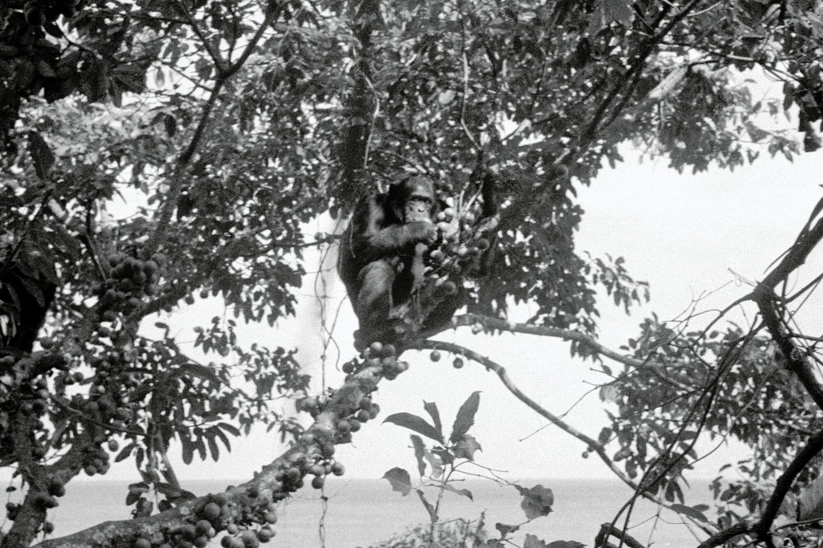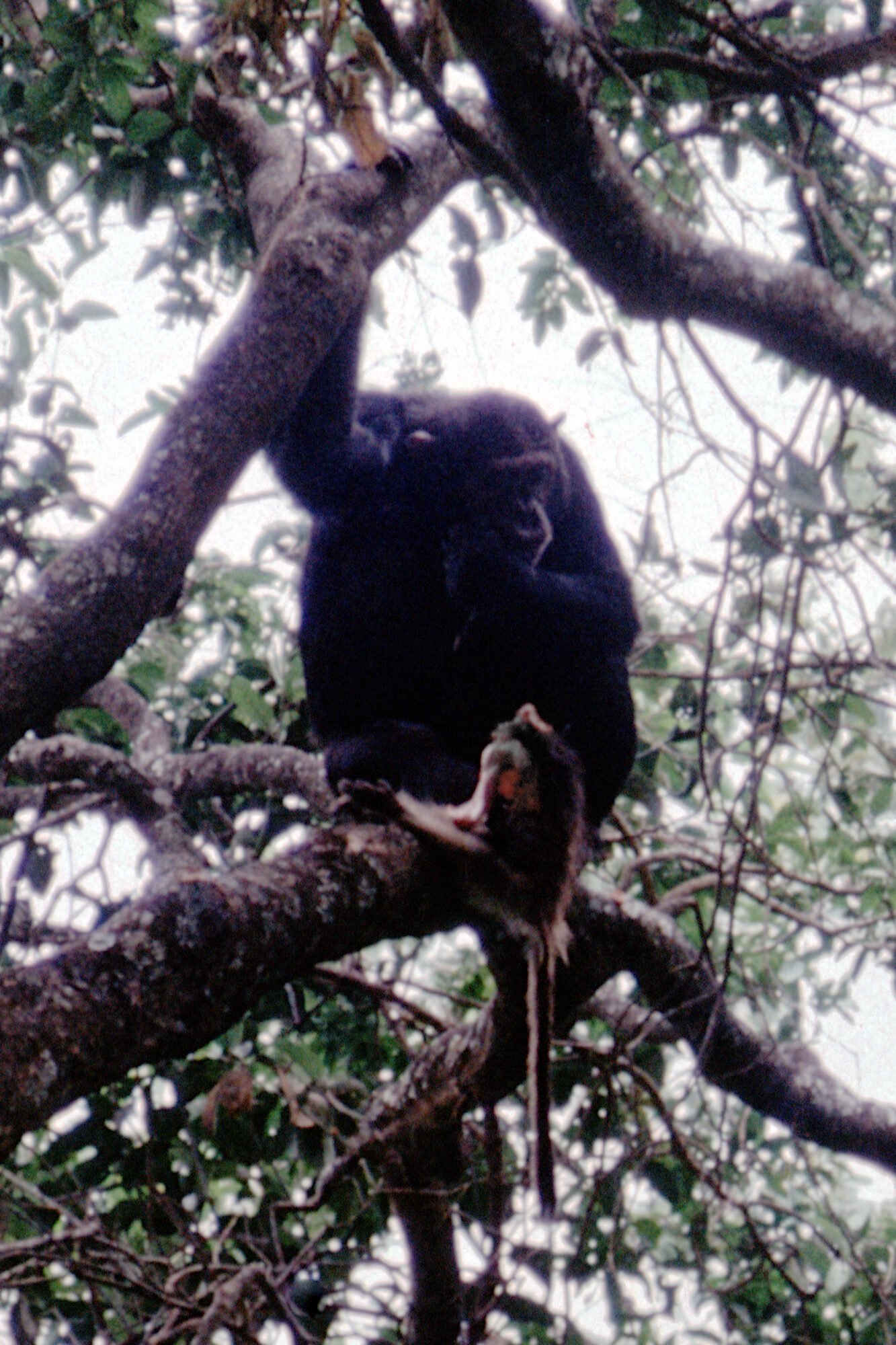 Colobus monkeys were seen in the distance north of the Linda stream. Perhaps these monkeys were part of the same troop which had been heard in the morning. The group Figan, Faben, Gigi, Goblin, and Sherry fed on misuri and mshai near lower LK4. Upon travel to the Linda-Kasakela ridge at 0908 the group “stumbled” upon another colobus troop in Upper Kasakela. After a 15 minute hunt, Figan caught a medium-sized “albino” monkey (see Predation Report). Jomeo, Nope, and Mustard arrived soon afterwards. Figan relinquished the carcass after a few minutes; Faben attacked Sherry and Gigi during the scramble for possession of the carcass. Meat-eating lasted for three hours. and the carcass was shared mostly by Faben, Figan, Gigi, Nope, and Sherry.