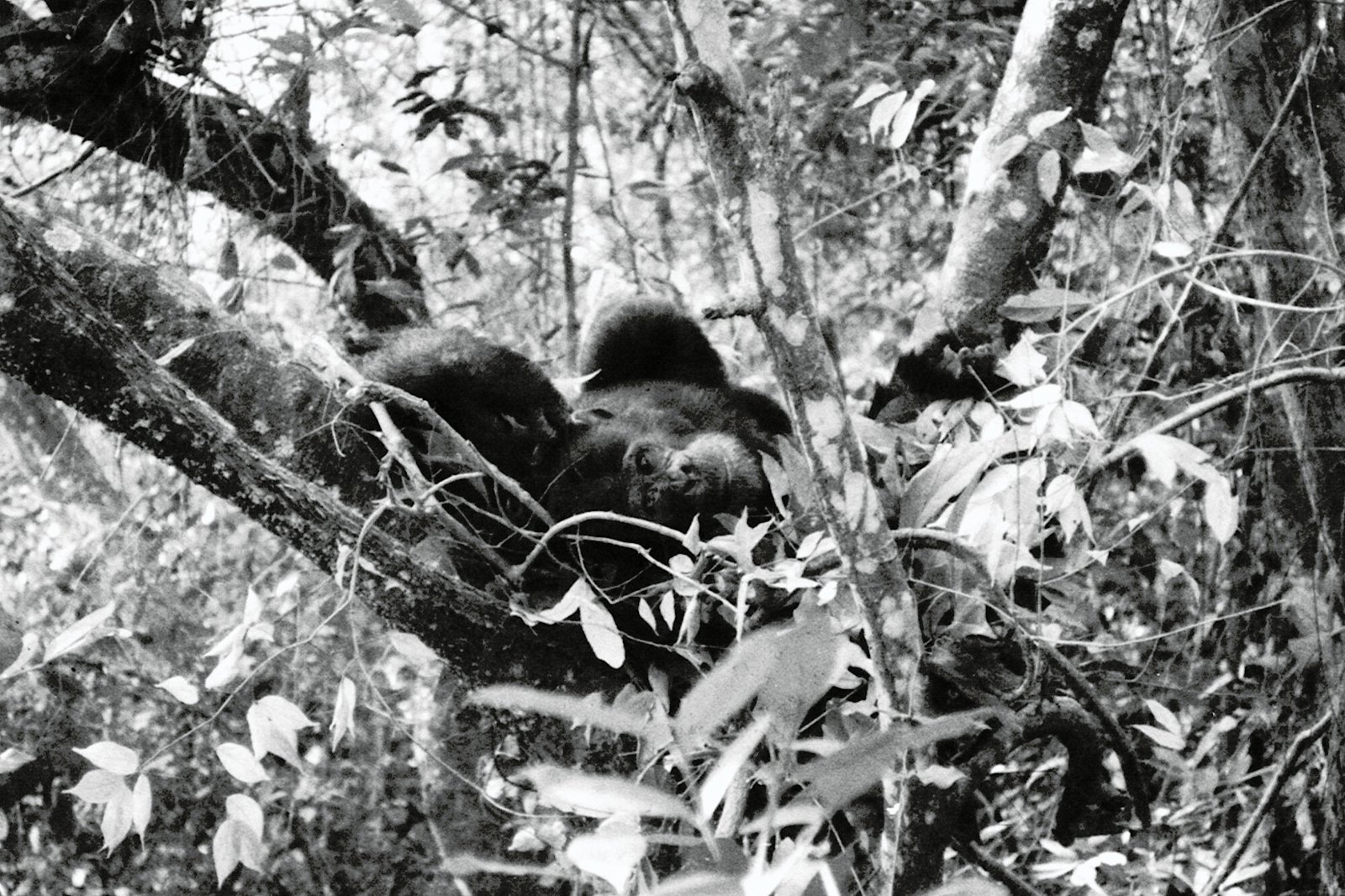 Curt’s Report. Gigi and Goblin descend to the ground at 0655. Figan displays to the ground and gets caught in the vines. This was one of the most bizarre beginnings to a follow as the chimps could never get their signals straight as to what they wanted to do. At first the group waited for Faben, then moved to the west where we had seen a colobus troop the previous evening. Monkeys were heard and Figan oriented towards them. Gigi touched Figan on the back and then disappeared as Figan moved towards the troop. Figan pant-hoot-displayed twice and was just walking in circles trying to find Gigi. Figan didn’t seem to know what to do, then finally he and Faben STREAKED across Upper Linda. Gigi was finally found near the Linda stream with Sherry and Jomeo.
