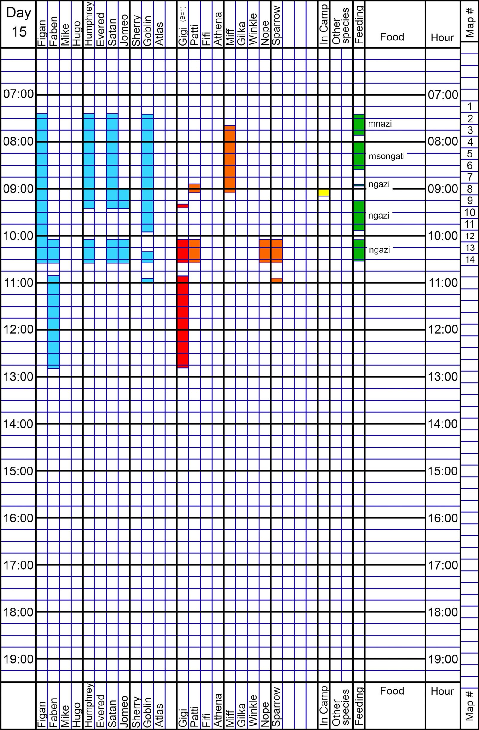 During a very long ASR sequence Satan brutally attacked Nope twice. Humphrey, Faben, Jomeo, Gigi, Sparrow, and Patti were also present. Figan fed on ngazi with the others and then traveled ahead with Jomeo to the waterfall. Satan was doing a streambed display downstream and we found Figan in the process of a brief (4 min) waterfall display. After the display he followed Jomeo up the rocks on the south side of the falls and he was hopelessly lost for the day. Upon returning to the bottom of the falls I found Faben and Gigi in the process of waterfall displays. I followed them for two hours, but there were no signs of Figan.