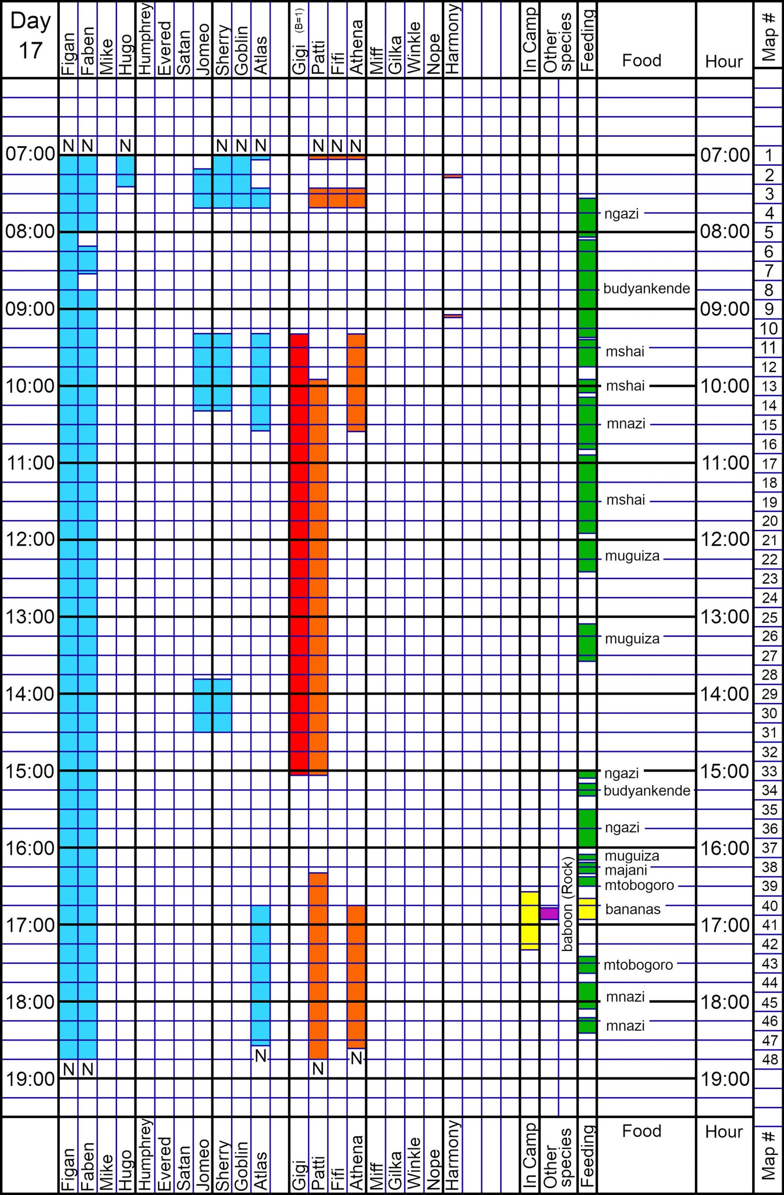 The chimps arrived in Camp and Figan and Faben were given bananas. Figan ate more than Faben, and Faben started to beg with Patti from Figan. Athena and Atlas came into camp; Faben went bipedal and hair-out and Patti avoided screaming.