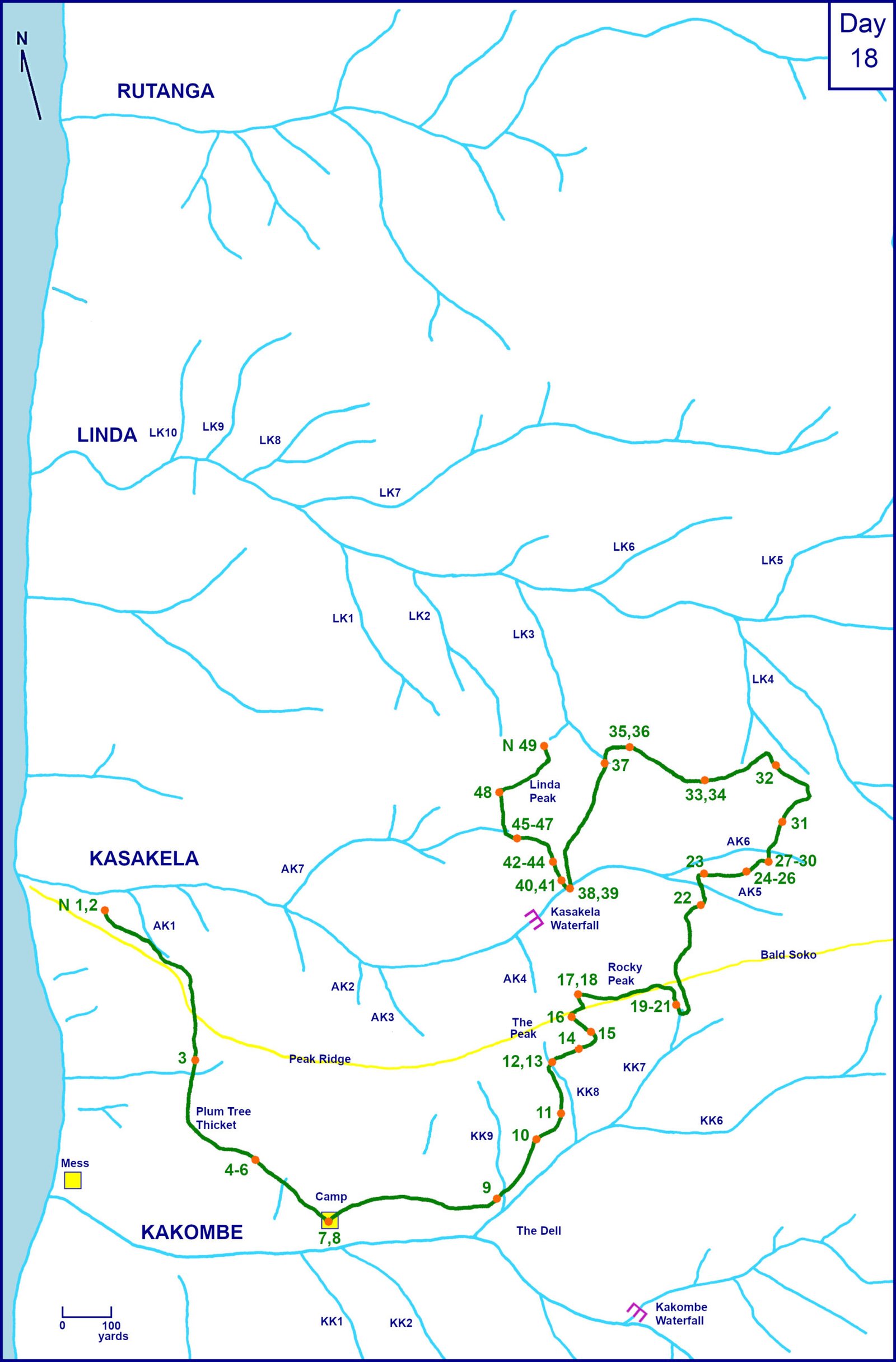 David’s Report. A quiet day with Figan and Faben returning to Camp via ngazi to meet Goblin, Hugo, and Gilka. They traveled east to find Satan and Gigi. Gigi traveled with them and Goblin and Patti the rest of the day, leaving Gilka, Hugo, Satan, and Sparrow. The highlight of the day was a Sparrow/Patti full-open-grin whimpering, screaming and squeaking hand dabbing at each other as Figan and Faben arrived. It lasted for 40 seconds in a palm tree within arm’s reach both females bobbed with little contact as Figan sat hair- out inspecting Sparrow. Strange. The group traveled up to Rocky Peak and then into Kasakela and almost into Linda when they turned back to hit the kifumbe near Linda Peak.