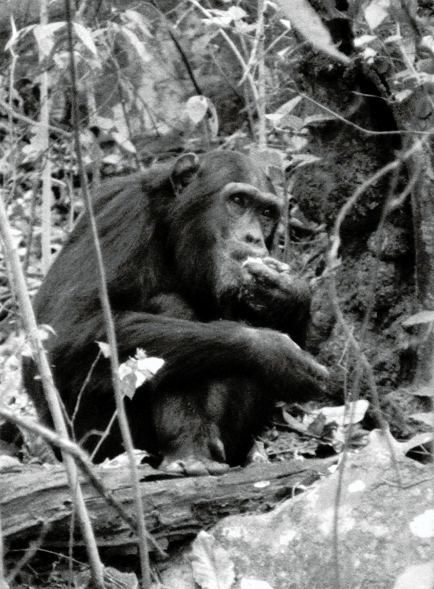 Figan became vocal and soon grunted at the following times: 1629, 1639, 1642, 1657, 1700, 1704, and 1706. Finally, she came after some branching by Figan also. Goblin and Patti, also hanging around, joined them. Gigi had eaten ants for about an hour, with two average stick fulls a minute: quite a haul and a meal. They met Nope and Mustard for a second time in the afternoon without incidence. Goblin and Mustard did not interact at all. They fed on kifumbe for 1 ½ hours before nesting nearby.