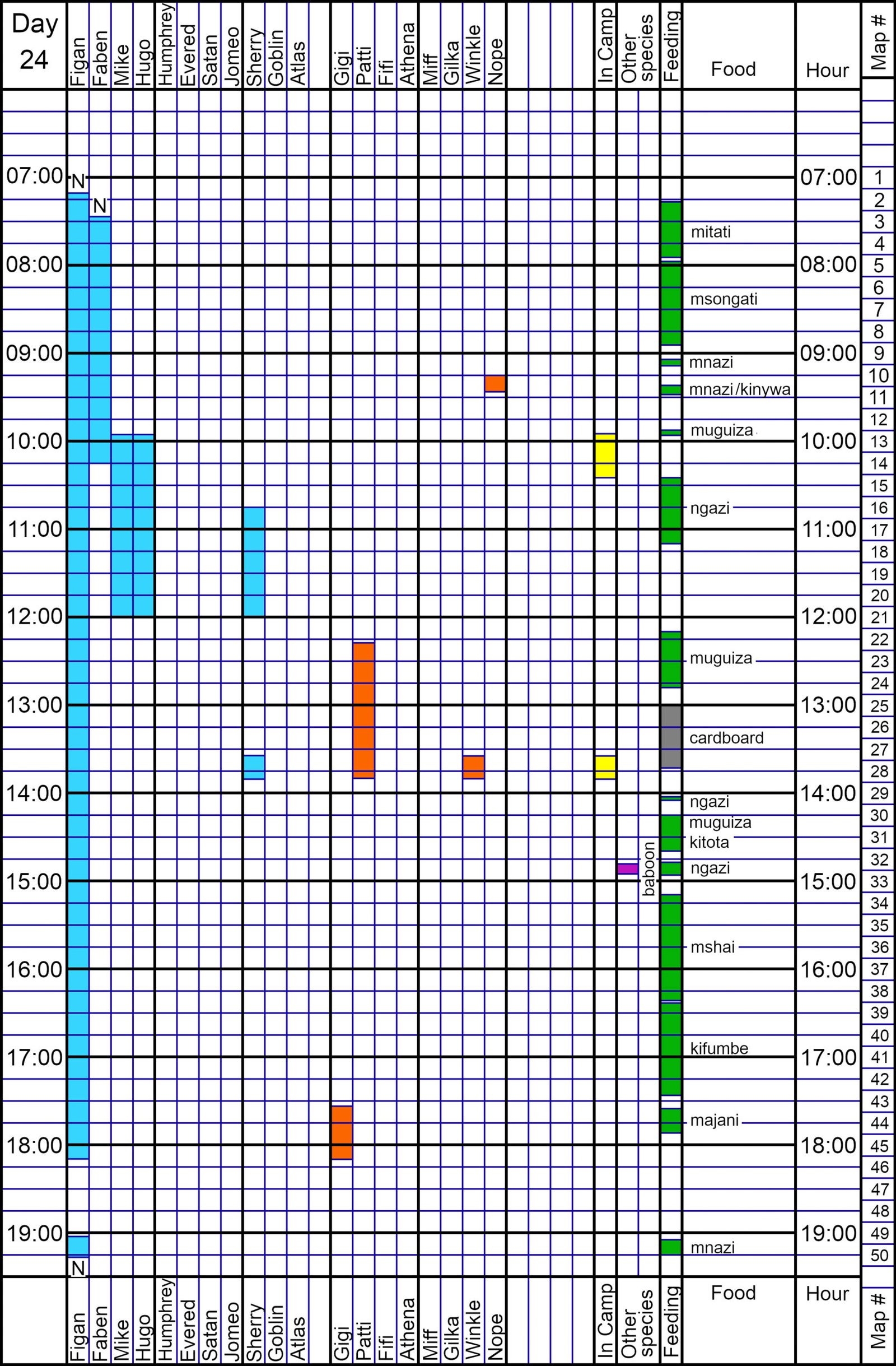 Figan drummed on the way to Camp and upon arrival at Camp where he met Sherry and Winkle (no ASR). Figan left Camp and headed for the KK6-KK7 muguiza tree. During travel at KK9, Figan drum-displayed; there were responses from Faben and others 200 m away, but Figan ignored them. Figan also fed on kitota and ngazi before passing through KK7 to Rocky Peak for mshai. Figan then hit the Upper Kasakela kifumbe tree for an hour.