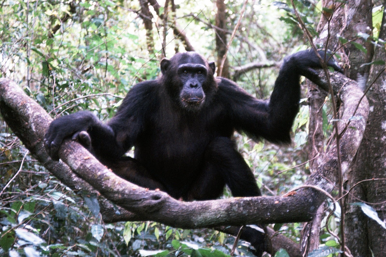 After brief feeding at the waterfall, Gigi traveled into Upper Kasakela. Figan followed her briefly then returned and traveled down the waterfall losing us hopelessly. We found Figan an hour later at 1902, feeding alone on mnazi near Peak Ridge in Kasakela. Figan continued feeding for 15 minutes before nesting.