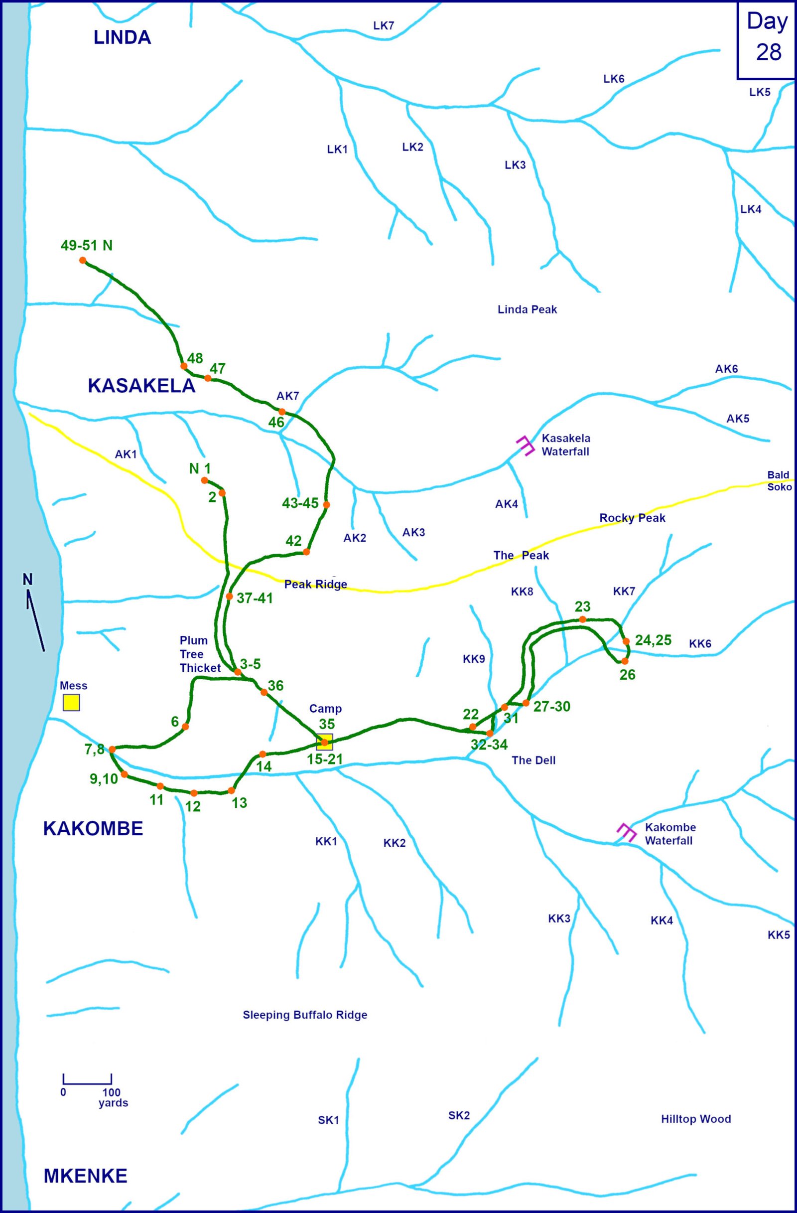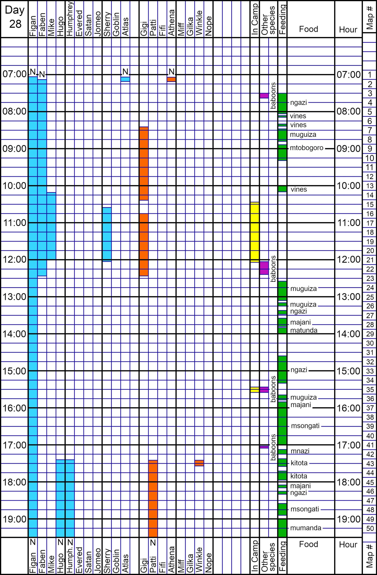 David’s Report. Figan and Faben traveled to the stream’s muguiza via Plum Tree Thicket instead of going to Camp first this morning. They later hit Camp after traveling with Gigi up the south side of the stream. They waited for the flat Gigi often. He spent an hour and a half in Camp with Faben, Mike, Sherry, and Gigi.