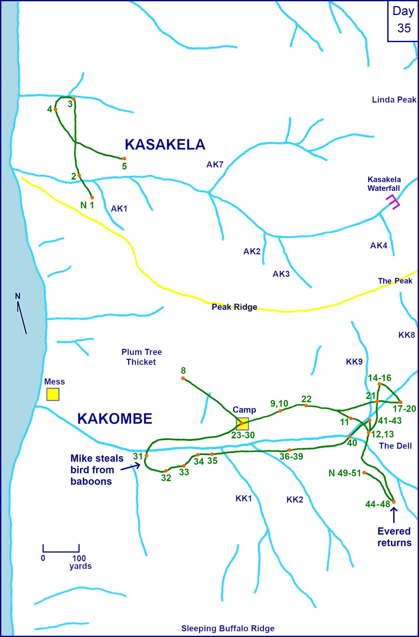 At KK0 they met Melissa, Gilka, Mike, and Fifi, and they followed a baboon. Mike stole from the baboon a part of a bird that it had killed. The next 20 minutes there were many incidents of baboon-chimp aggression. Goblin was attacked by the adult male possessor of the carcass and then Figan attacked Goblin out of frustration (see Predation Reports). The group dissolved and Figan moved east again and fed on ngazi and vines. Later he arrived to see Faben, Humphrey, and Gilka. Faben left, and Humphrey and Gilka fed together near the Dell. There were many pant-hoots throughout the afternoon in the valley. The chimps worked themselves up lower KK3 area and by 1800 were feeding on kitota.