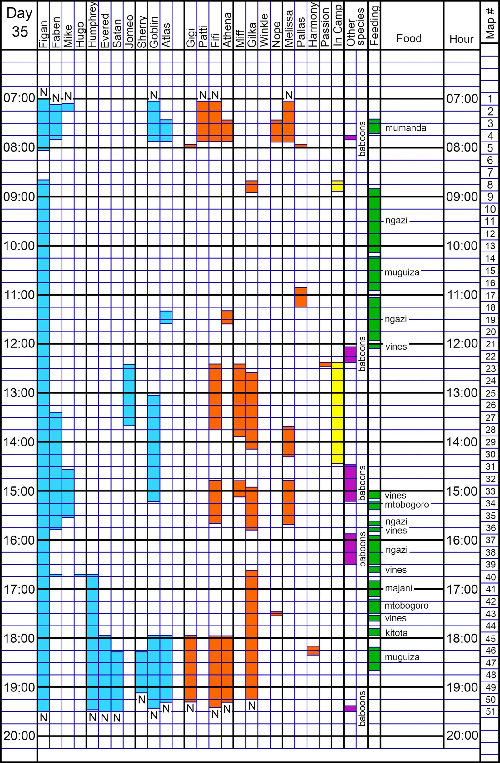 1815 By now all the animals are feeding in the tree (Gigi, Gilka, Sherry, Satan, Fifi, Athena, Atlas, Evered, Figan, and Humphrey). There are many screams from the valley (Faben seen there around 1700).