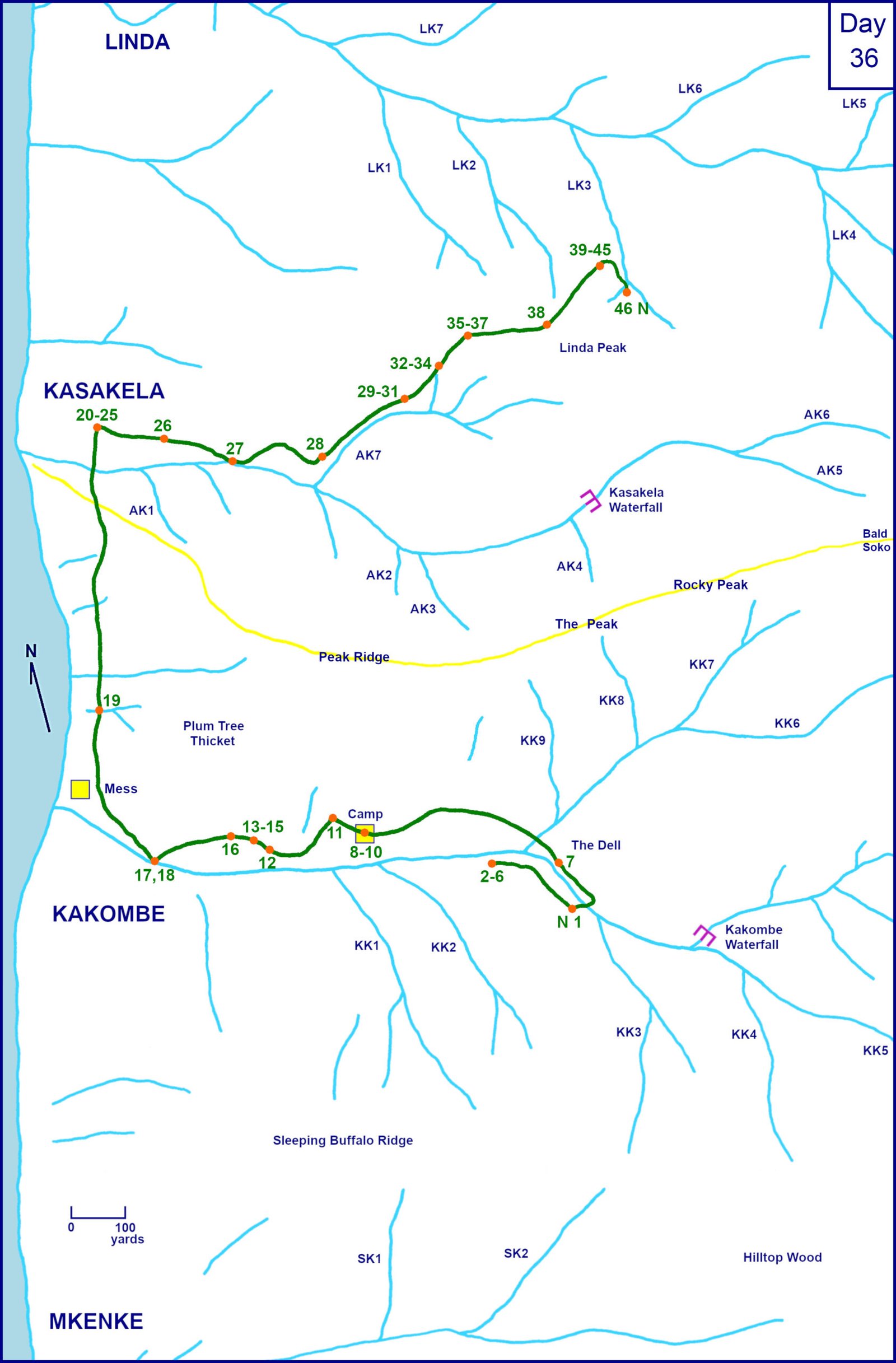 Nesting Detail: Figan nests alone on Linda Peak. He had eaten mnazi leaves from 1603 to 1653 and then rested in his tree. Then he ate again from 1732 to 1736 and then sat until 1742 and then walked upslope to a nest that he used three weeks ago. He looked up at the nest for some three minutes before he bit off three branches of soft leaves and carried the leaves up in the tree to refurbish his nest. He made the nest with these leaves and others; the nest was his old one that he used on the night of Day 18.