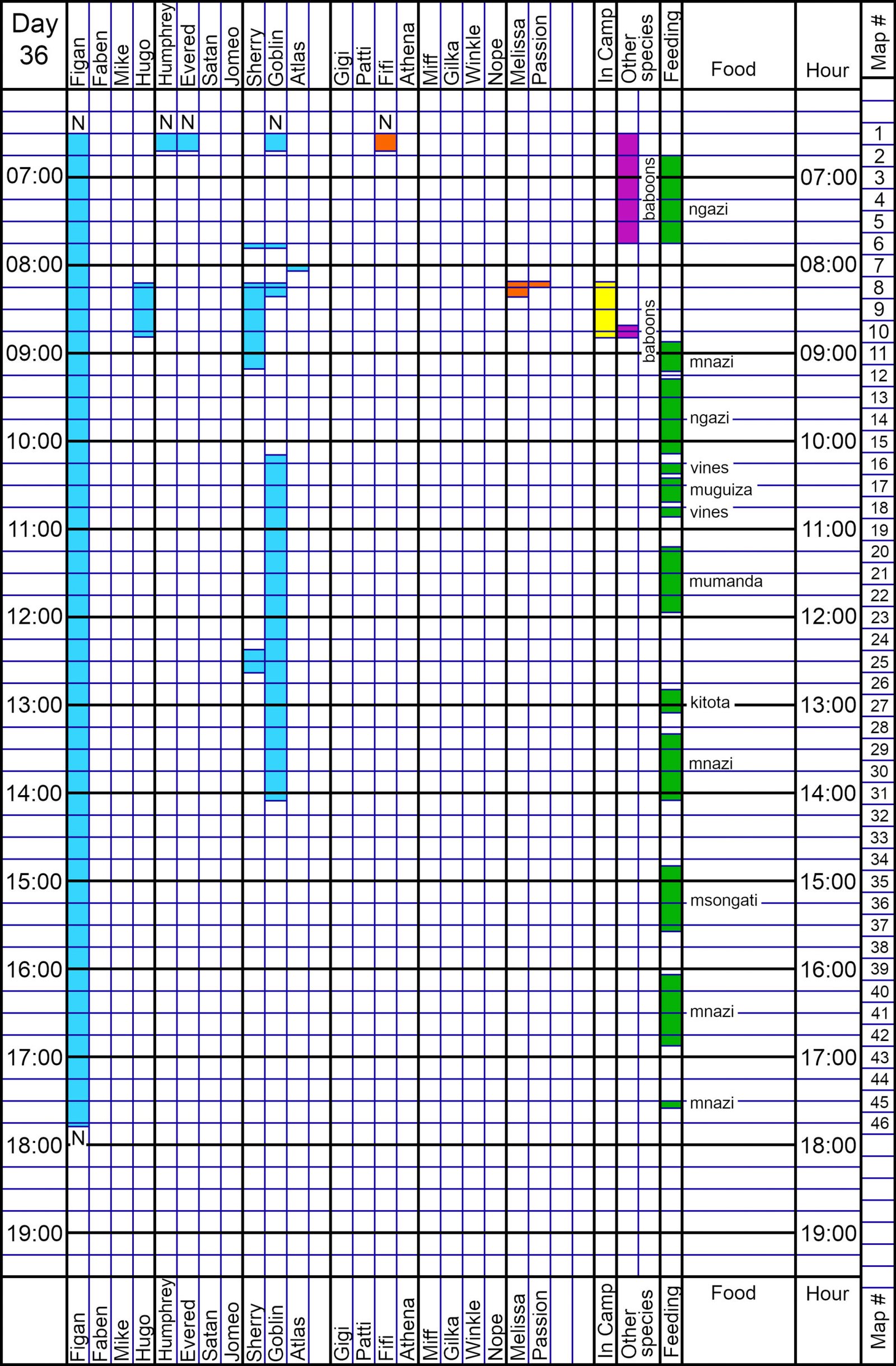 Figan awoke early to display four times and drum twice in the presence of Evered and Humphrey. Evered avoided his nest at 0630 and Figan proceeded to destroy it. He went off on his own to eat ngazi until 0745. He returned to the nesting site to find no one … He then drummed twice, but no one answered him. He saw Atlas near the Dell and ran into Passion on the trail to Camp. He arrived in Camp to find Melissa, Goblin, Sherry, and Hugo.