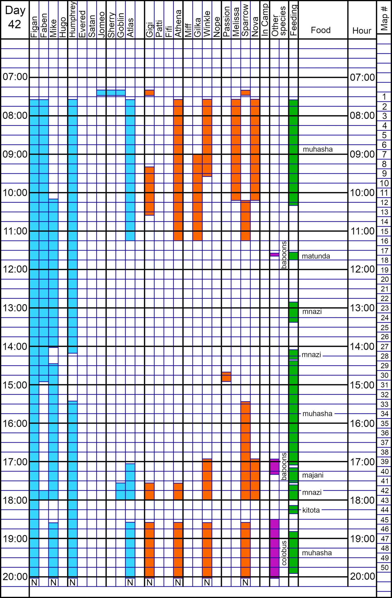 They quickly headed back, Figan and Faben breaking from Humphrey and Mike for a short while, to KK3 for another three hours of muhasha. Many chimps were in the valley, and then Figan ate with Mike, Humphrey, and Sparrow. But also in the valley were Passion, Athena, Nova, Winkle, Gigi, Goblin, Faben, and others. They nested in KK3 again after late feed on muhasha, which was interrupted by a little kitota and mnazi leaves.