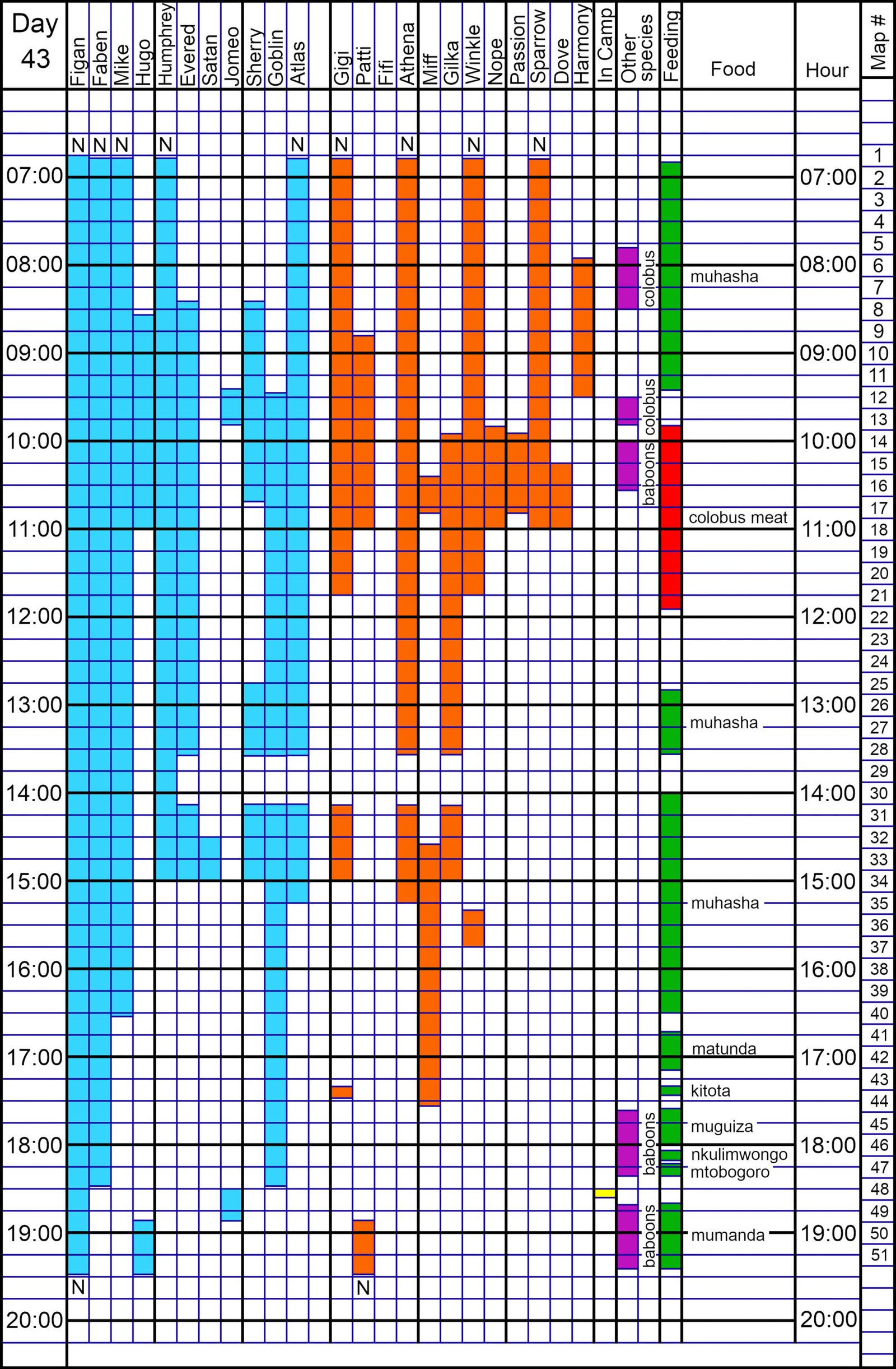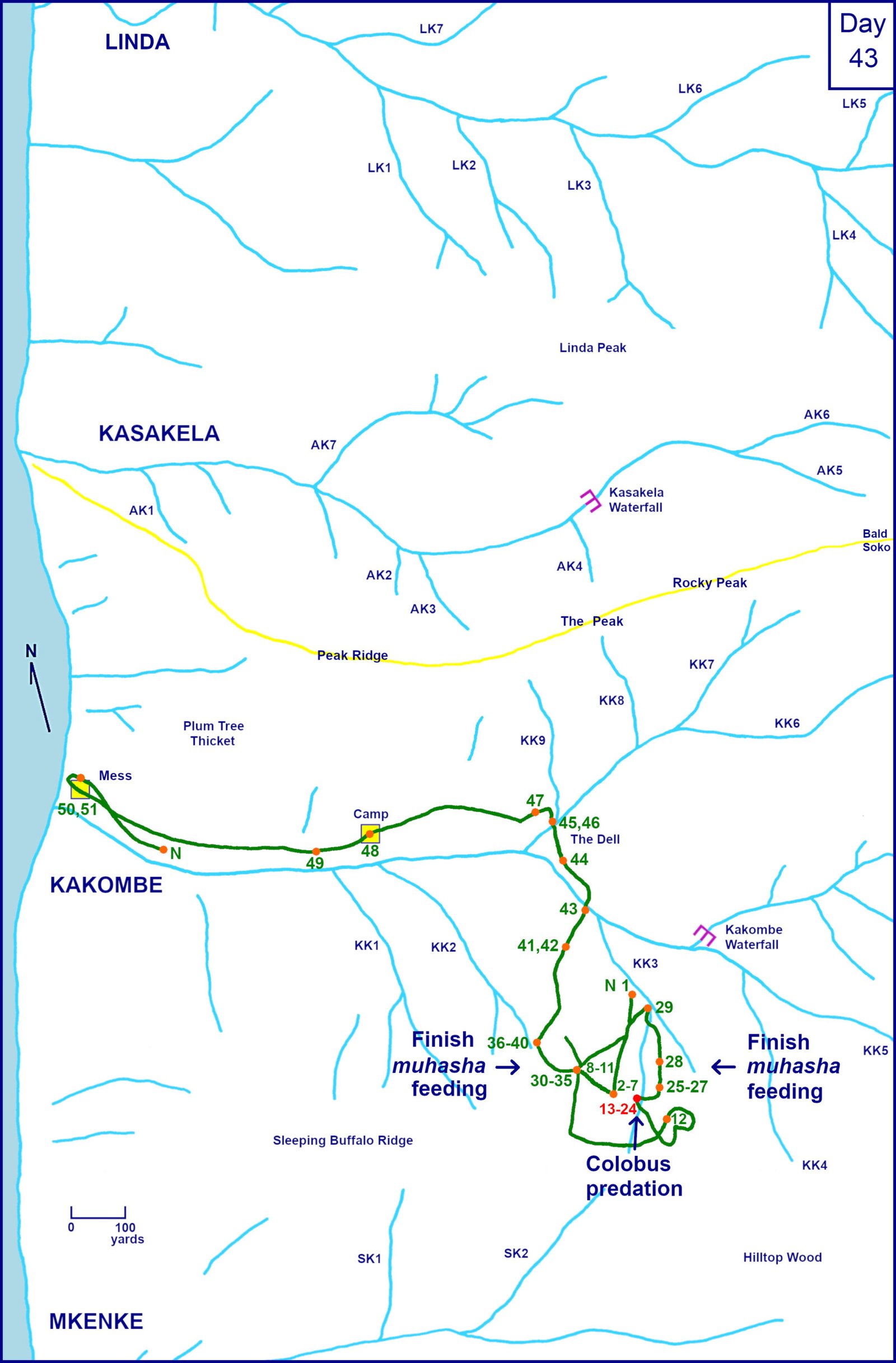 After several more hours of muhasha following the kill, Figan and Faben with Miff and Goblin left KK3, as others had done during the afternoon. At 1630 they started down to the Dell and Figan arrived in Camp alone at 1830. He ended up nesting in Kakombe downstairs. Our young strange mother-infant pair [Harmony and Beethoven] was seen during muhasha feeding in the morning and at the predation.