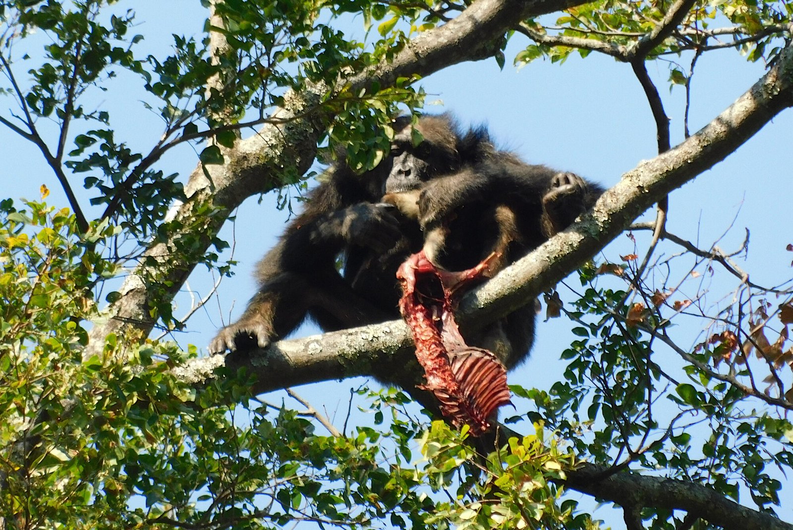 Old adult male Sheldon (age 41) was found eating a colobus monkey on July 15, 2024. During 30 minutes of observation, Sheldon remained silent and made no attempt to recruit other chimps to share the carcass.