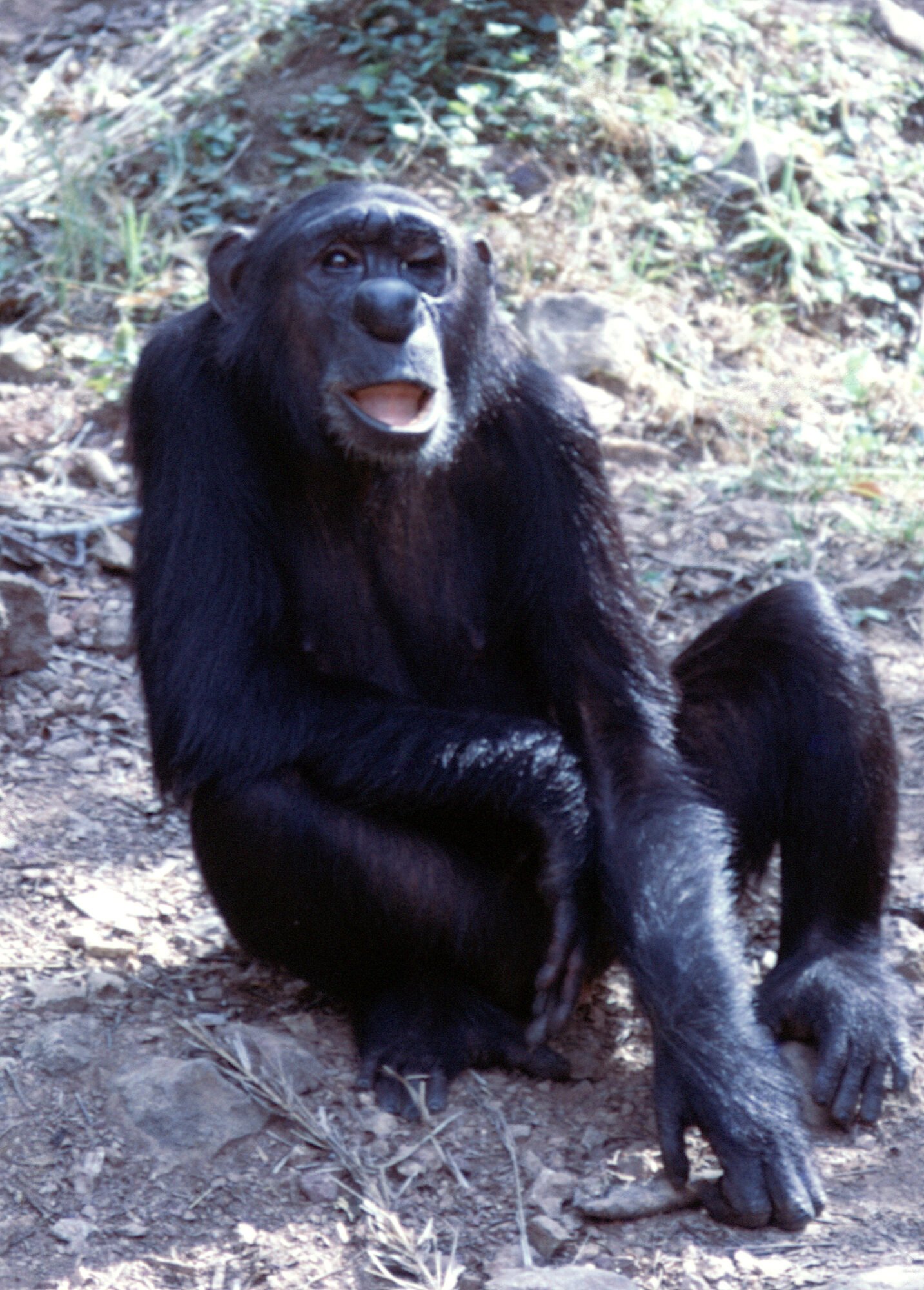 Many [human] guests are in Camp and Figan moves off to the east and looks back up to where Satan and Evered groom. He does a display after 15 minutes of hair-out rocking periodically. He charges across the banana trench while Evered is pant-grunting and bobbing, and Satan pant-grunts. He runs nearly into Jomeo, who is just arriving from south and Figan doesn’t know it. Jomeo avoids into tree and Figan follows and full-open-grin scream with hair-out mount embrace Jomeo who avoids after a few seconds and Figan reappears and grooms Jomeo for 2 hours mutual.