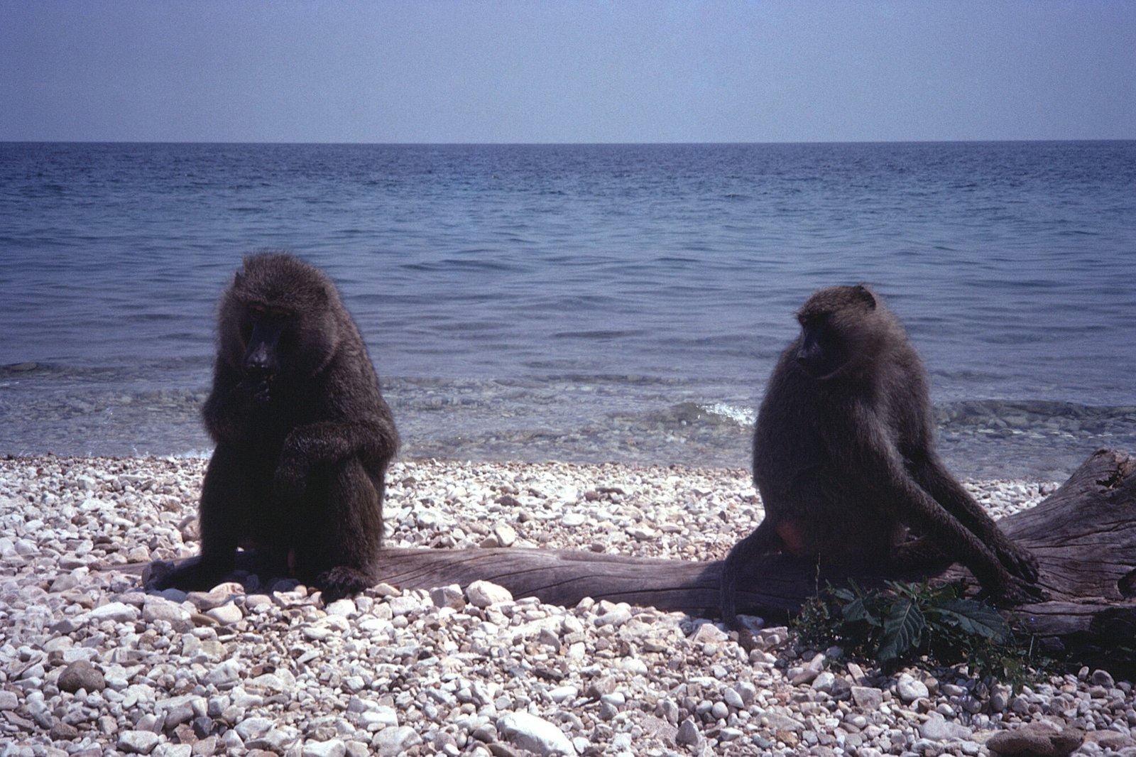 Adult male and female baboons on the beach.