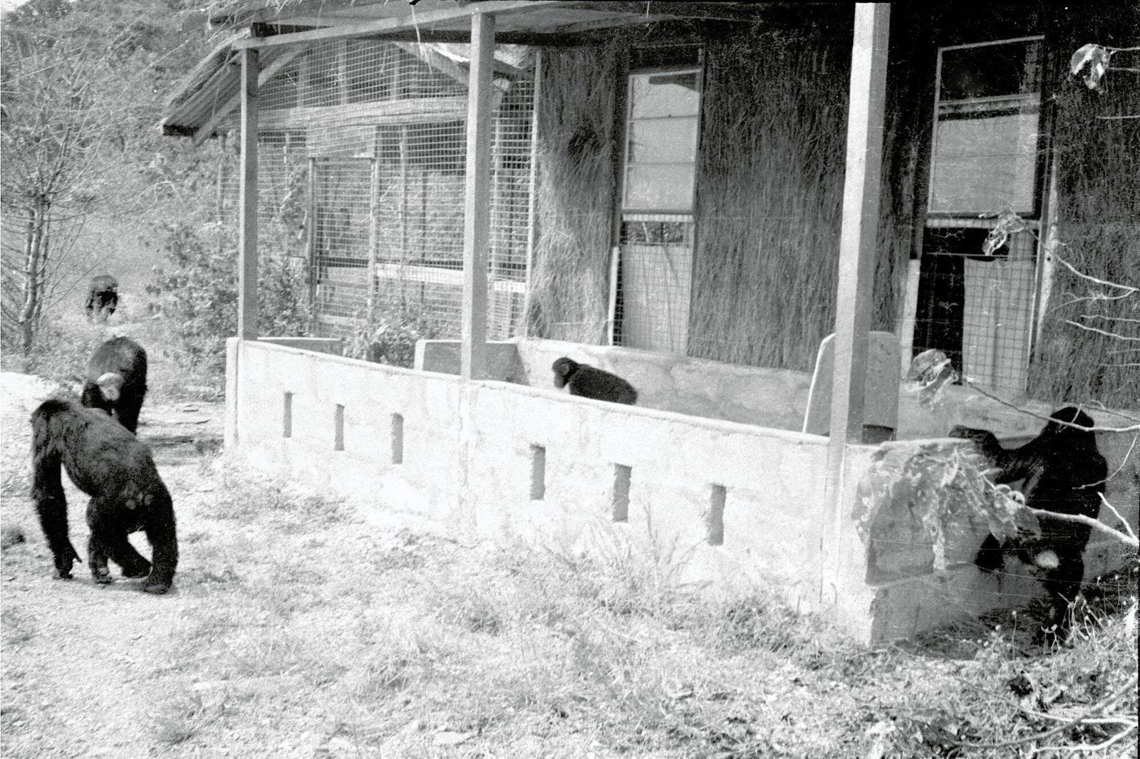The Cage was an open enclosure made of wire mesh and a corrugated metal roof. Located along the lake some fifty yards north of the Mess, this is where Jane’s young son Grub could play and relax in relative safety from the potentially aggressive chimpanzees. The cinder block building adjacent to the Cage might have been Jane and Hugo’s first residence.