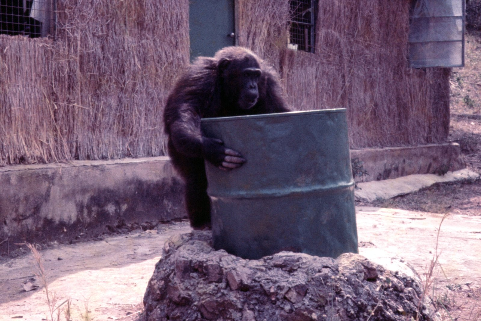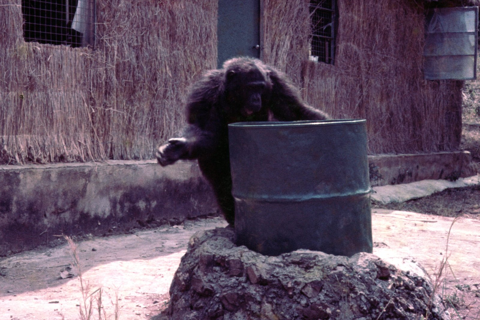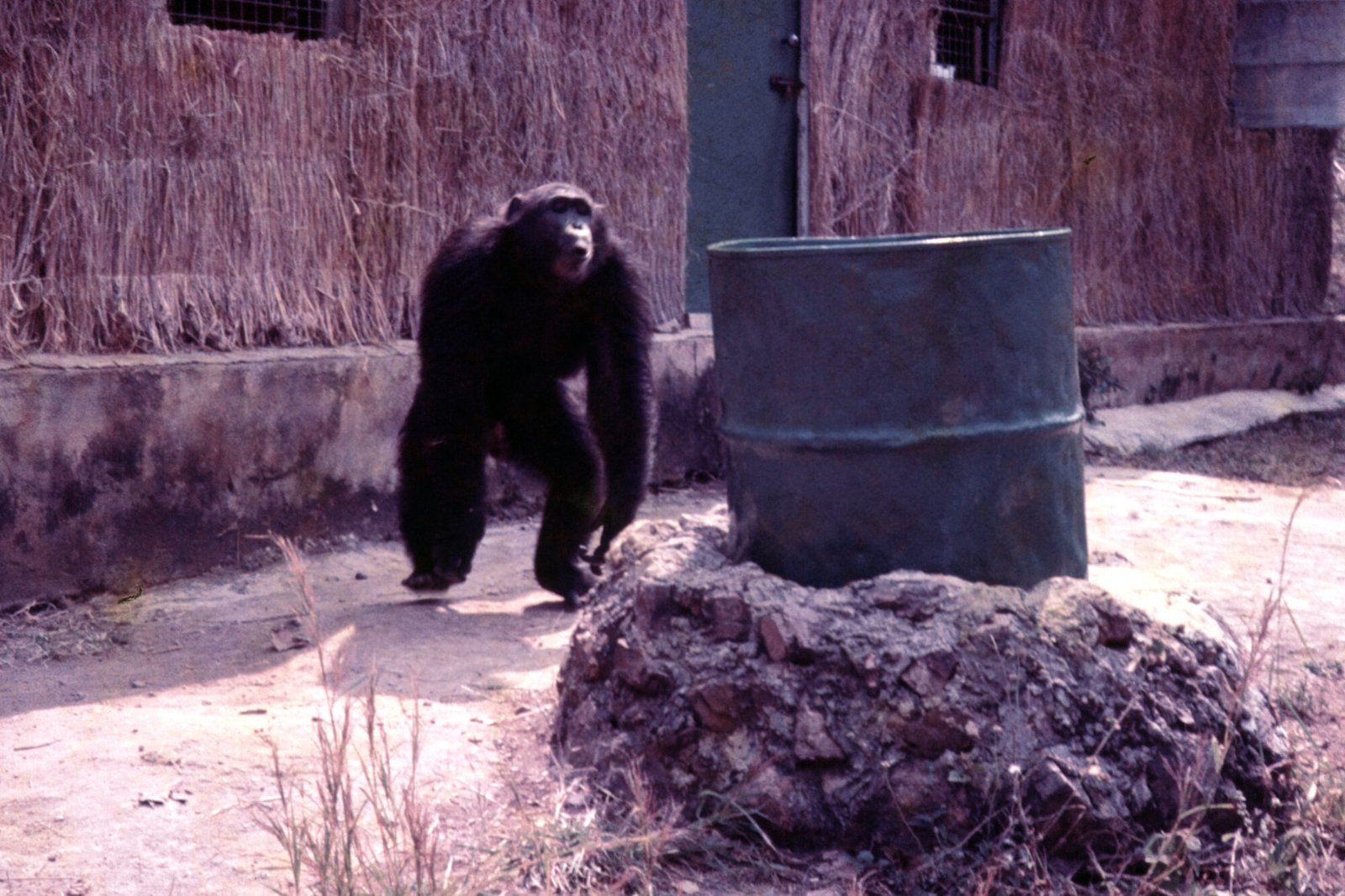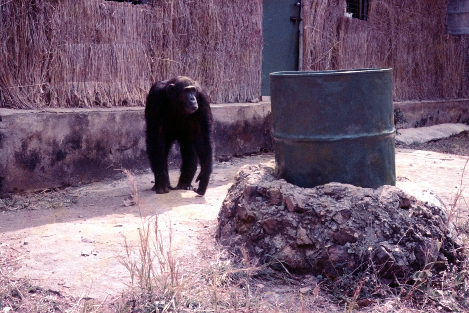 In the era of the Figan Follow, chimps received bananas via a “banana trench” that was attached to the main research building (Pan Palace). A door led from inside Pan Palace into the walkable trench, where bananas could be loaded into six small compartments with trap doors that could be released from inside the trench.