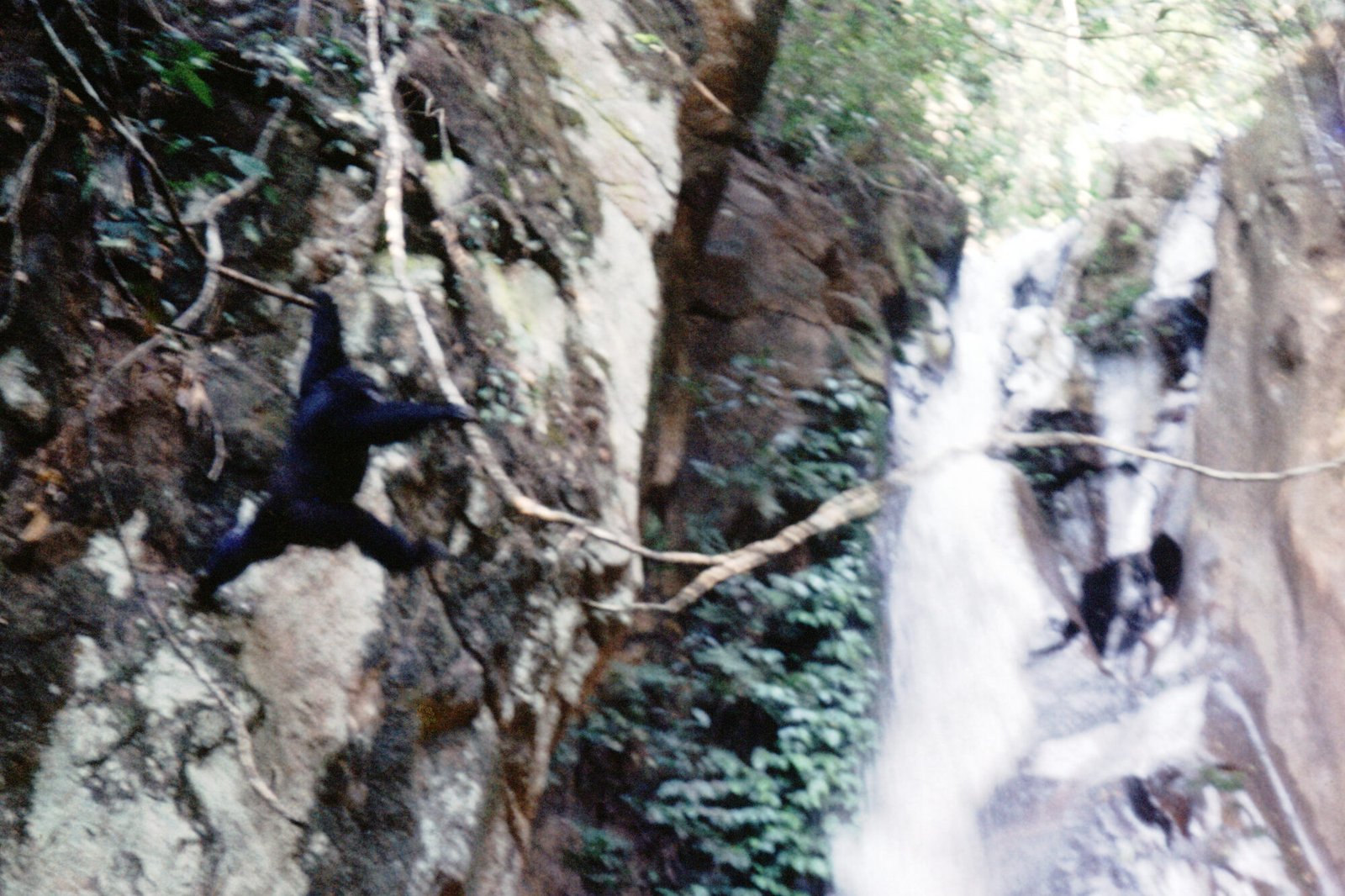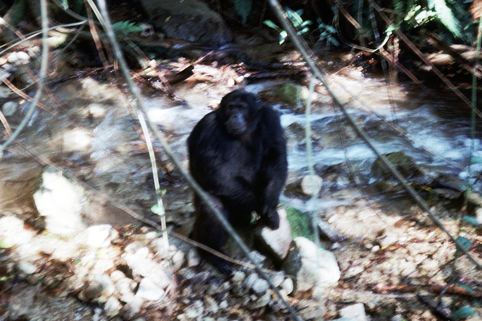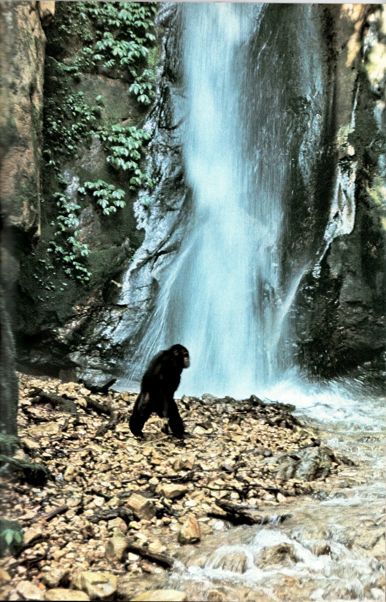 These same behaviors were later observed along streambeds and at waterfalls. In 1969, Harold Bauer saw an adult male chimp display or “dance” at a waterfall. This observation was cited as a possible instance of a non-human animal demonstrating a sense of wonder,2 a view championed by Dr. Jane (below). Waterfall displays are spectacular albeit uncommon. During their combined ~1,600 hours observing adult male chimps at Gombe, Curt and David witnessed a grand total of four displays at the Kakombe waterfall.