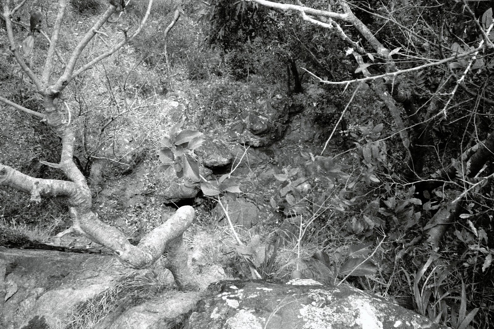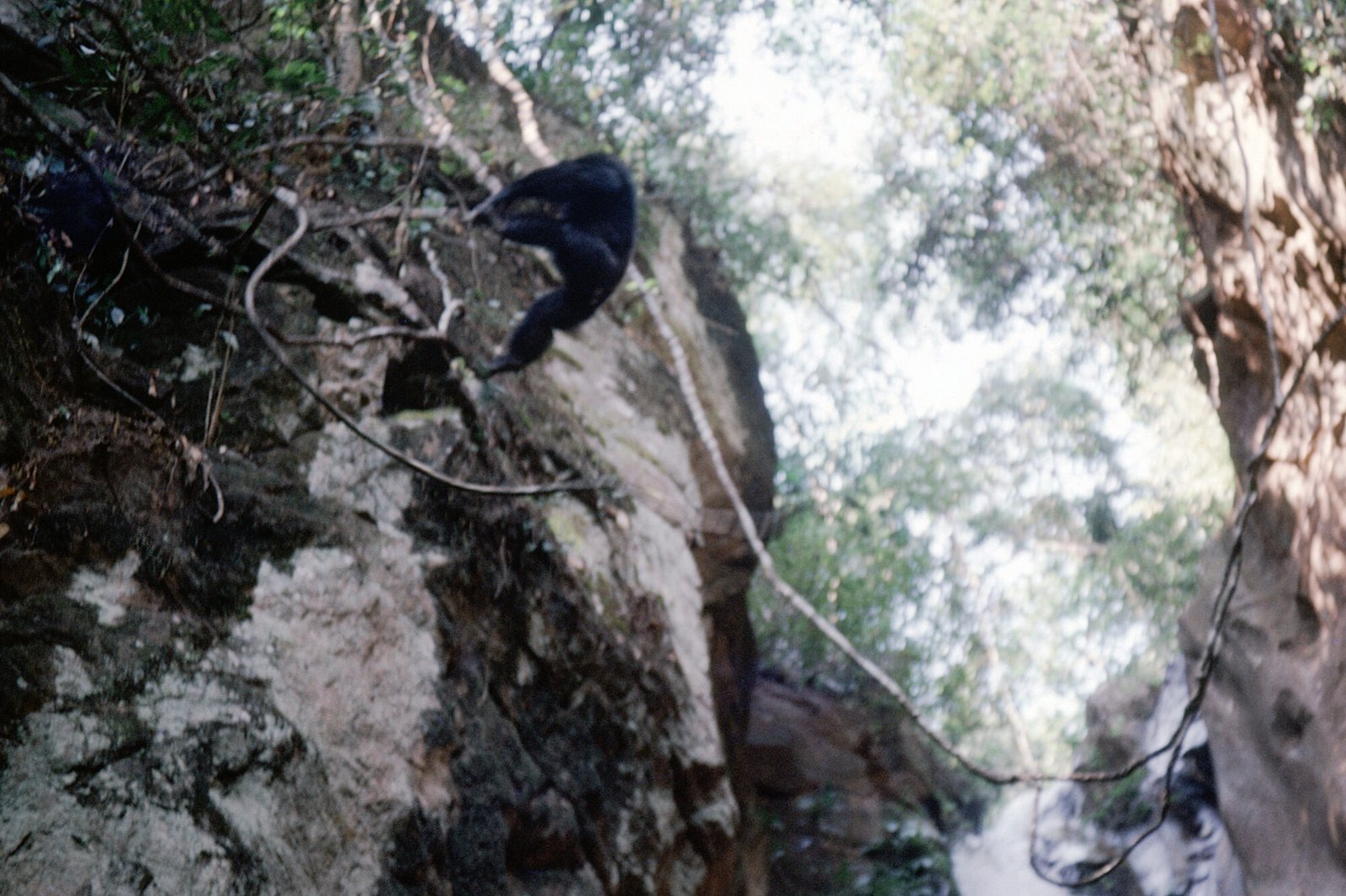 Kasakela is a relatively small valley wedged between the larger Kakombe and Linda valleys. The waterfall has a vertical drop of about 50 feet, but in the dry season it has no running water. During the Figan Follow, the chimps sometimes traveled between Kakombe and Linda valleys by passing near the top of the Kasakela waterfall. The photos below are of Mike and Figan along the edge.